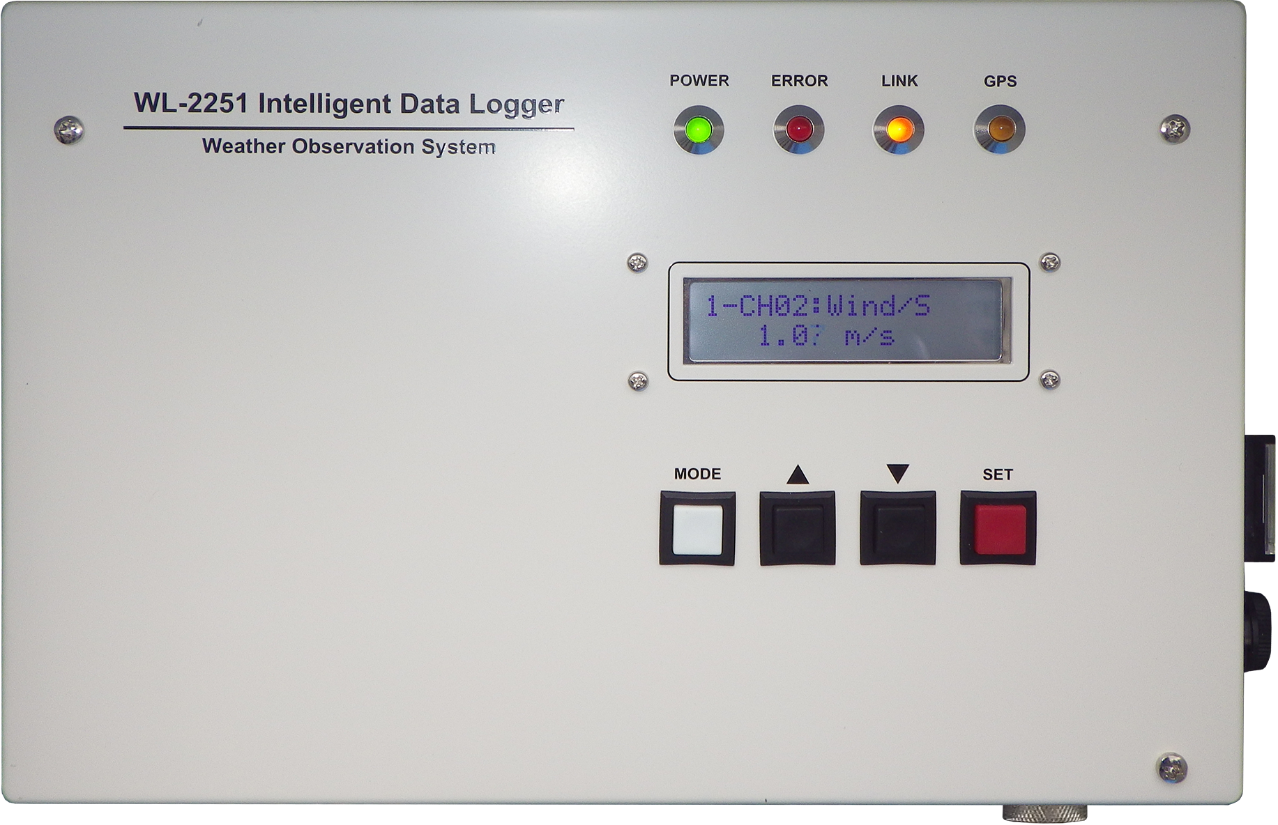本機は、低消費電力で動作するデータロガーで、商用電源の無い観測場所においても ソーラーパネルとバッテリーを組み合わせることで、自動気象観測システムが運用できるという 特徴があります。接続できる観測機器は、三杯風速計、矢羽風向計、温度計、湿度計、日射量、 転倒マス雨量計、気圧計で、一般的な総合気象観測で必要とされる要素をサポートしています。 本機では、瞬間値のほか、平均値、最大値、最小値などの統計値も計算し、その結果は データロガー内に記録します。さらに、データロガーにモバイルルーターなどの通信機器を接続することで、 統計処理された観測データを10分に1回の間隔で、遠隔のデータ収集サーバーへリアルタイムに データを送信することが可能です。